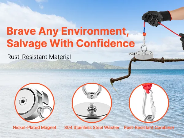 Zowel de vismagneet als de accessoires zijn gemaakt van roestvrij staal of voorzien van een roestwerende laag. Ze zijn waterdicht, slijtvast en voorkomen effectief slijtage, waardoor een langere levensduur wordt gegarandeerd.