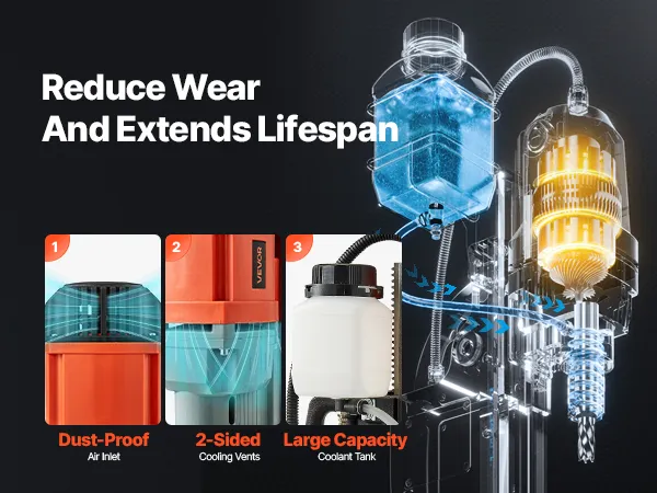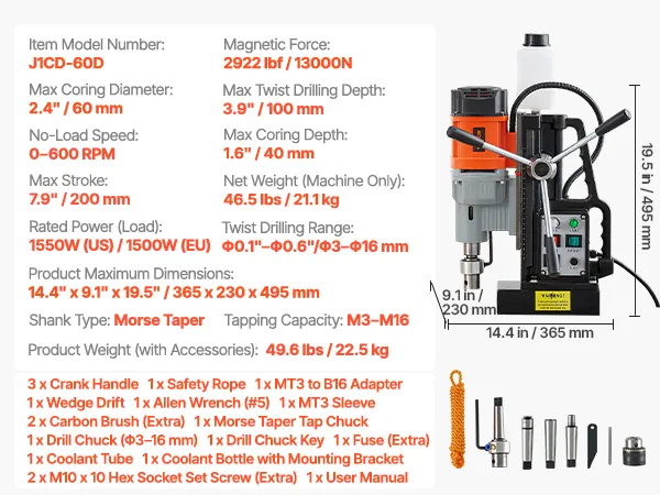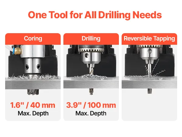 3-in-1 prestatiefunctie: Deze magneetboormachine ondersteunt kernboren, tappen en boren. Met een verbeterde kerndiameter van 60 mm kan hij grote projecten gemakkelijk aan. Spiraalboorbereik: Φ0,1-Φ0,6 inch (Φ3-Φ16 mm), tapbereik: M3-M16