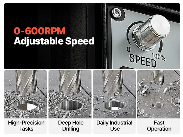Nauwkeurige controle: Deze magneetboormachine heeft een toerentalinstelling van 0 tot 600 tpm voor flexibele aanpassing aan het materiaal en de taak. Lage toerentallen maken fijn werk mogelijk, terwijl hoge toerentallen snel boren mogelijk maken. De geïntegreerde diepteschaal zorgt voor consistent nauwkeurige resultaten.