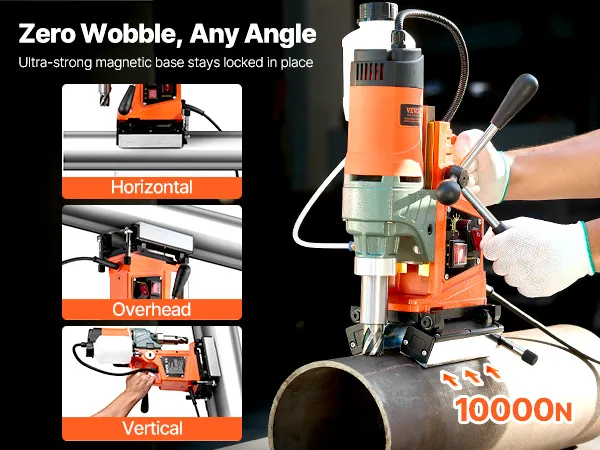 Stabiele magneetvoet: Dankzij de 10.000 N sterke magneetvoet en de trillingsdempende riem kan deze magneetboormachine veilig worden bevestigd op vlakke stalen en gebogen buizen (Ø 80-300 mm) en ondersteunt hij rechtop, zijwaarts en bovenhands boren met een sterke houdkracht voor stabiel gebruik.