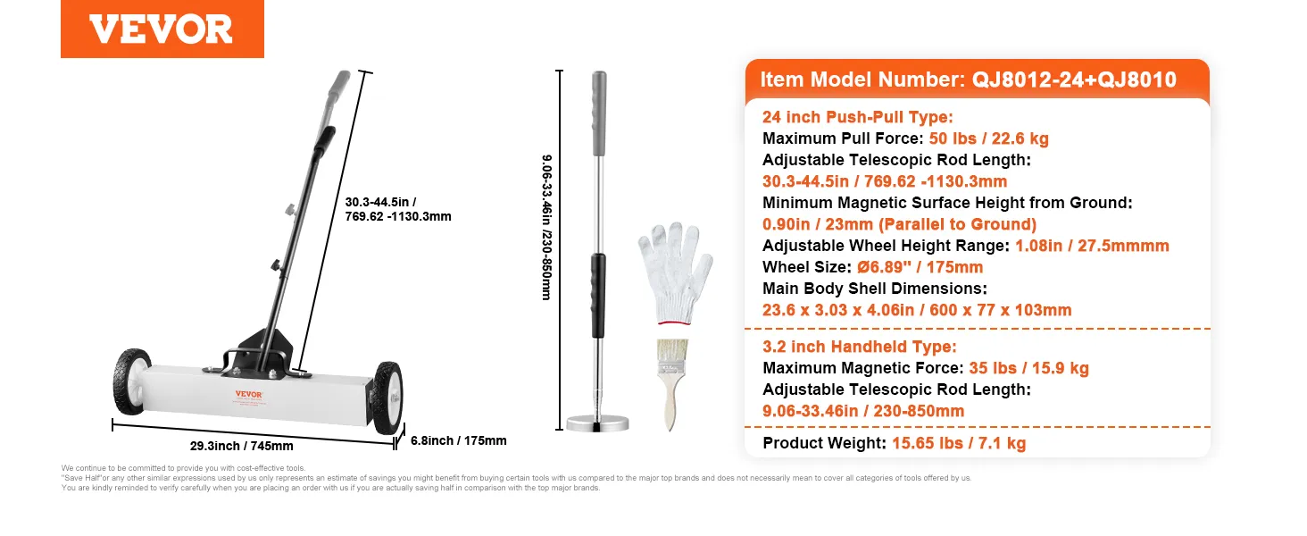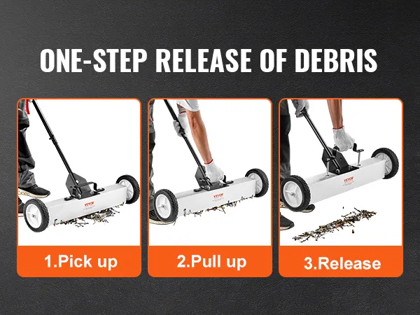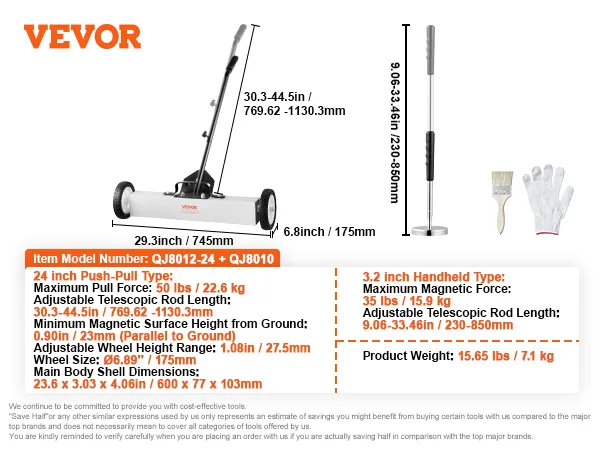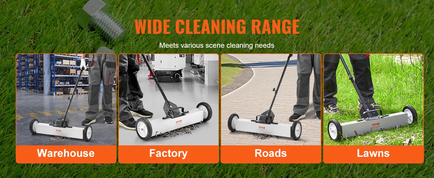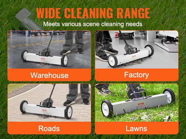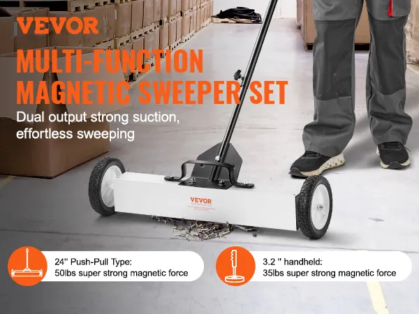 Superieure magnetische kracht: de VEVOR magnetische bezem op wielen bestaat uit een 24 inch magnetische bezem op wielen en een 3,2 inch telescopische magnetische bezem, die respectievelijk maximaal 50 lbs / 22,6 kg (24 inch / 61 cm) en 35 lbs / 15,9 kg kan bevatten (3,2 inch / 8 cm). Het verzamelt gemakkelijk spijkers, schroeven en zwarte metaalresten en beschermt je tegen gebroken glas en scherpe metalen.