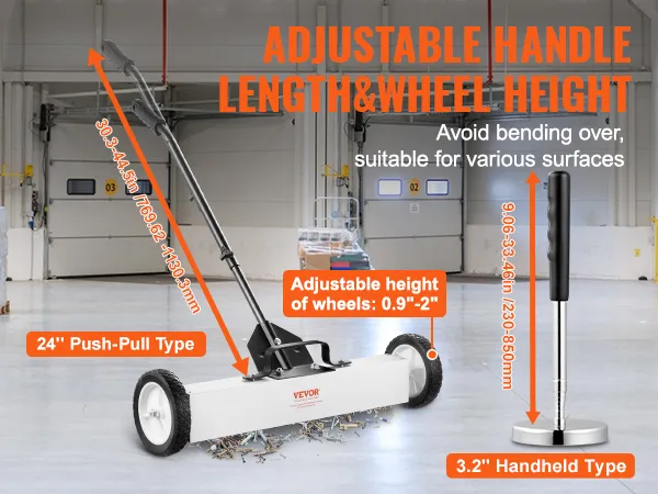 Verstelbare hoogtes: De telescopische handgreep is in hoogte verstelbaar. De 24 inch rollende magnetische bezem kan van 30,3 tot 44,5 inch (769,62 tot 1130,3 mm) zijn en de 3,2 inch telescopische magnetische bezem kan van 9,06 tot 33,46 inch (230 tot 850 mm) worden ingesteld. Geen vermoeiend bukken meer dankzij praktische opslag en eenvoudig transport.