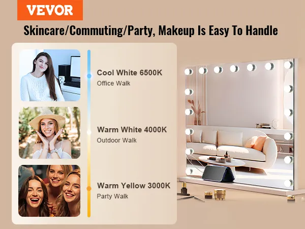 Driekleurige lichtbron: Uitgerust met koud licht (6500K), warm wit licht (4000K) en warm licht (3000K) driekleurig licht, met traploos instelbare helderheid via het touchscreen, dat het echte omgevingslicht in verschillende scènes simuleert, Of het nu gaat om woon-werkverkeer of een avondfeest, make-up kan het u gemakkelijker maken.