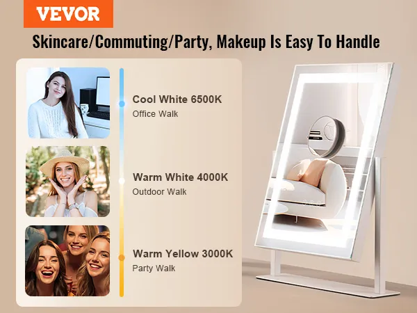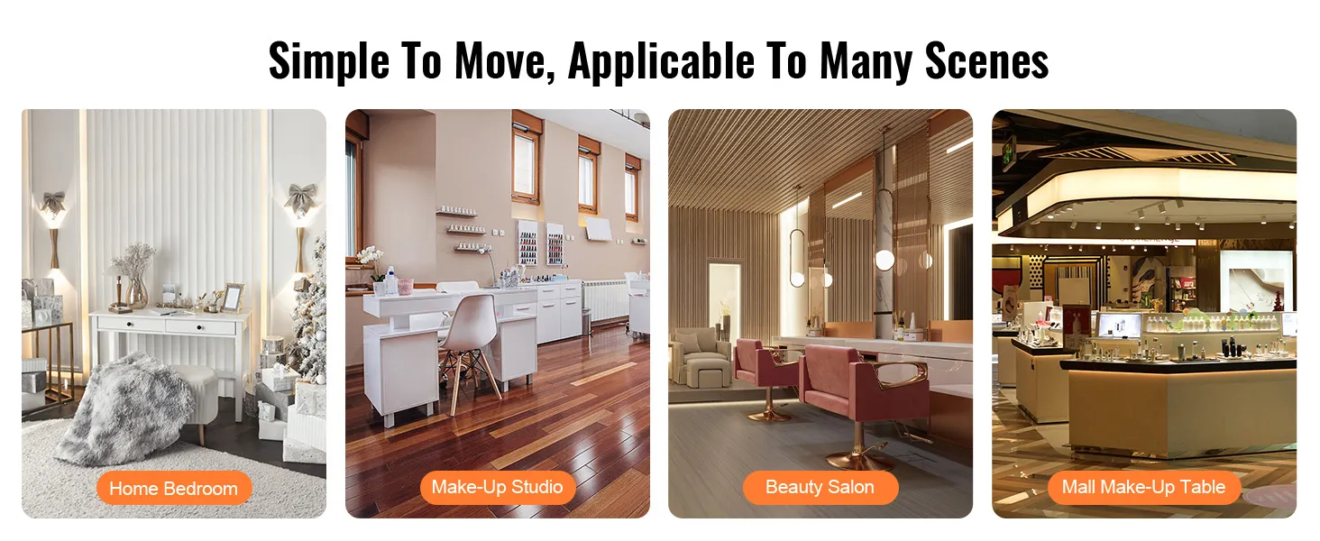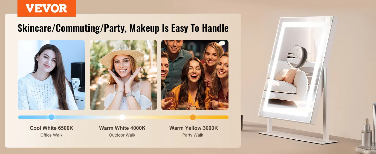 Driekleurige lichtbron: Uitgerust met koud licht (6500K), warm wit licht (4000K) en warm licht (3000K) driekleurig licht, met traploos instelbare helderheid via het touchscreen, dat het echte omgevingslicht in verschillende scènes simuleert, Of het nu overdag woon-werkverkeer of een avondfeest is, make-up kan het u gemakkelijker maken.