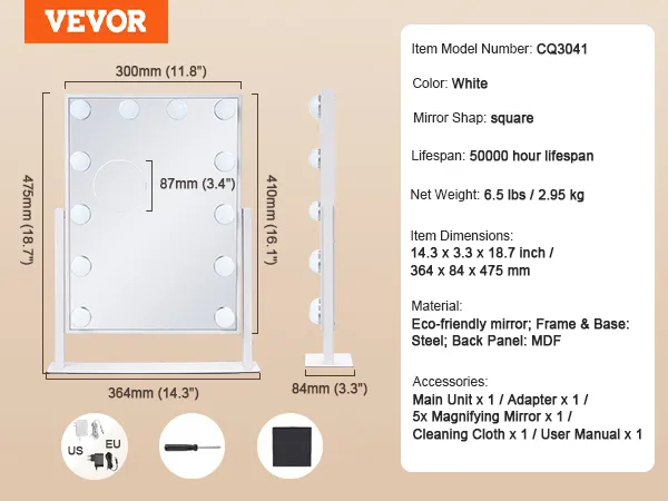 5x vergrotende spiegel: φ 3,43 inch / 8,71 cm afneembare 5x vergrotende spiegel met 2 zuignappen kan op elk moment aan de spiegel worden bevestigd. 5x vergroting van uw mascara- en lippenstiftmake-updetails. Geen ingepakte spiegel voor een breder en schoner zicht.