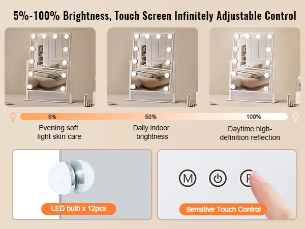Raak eenvoudig de spiegel aan om de helderheid van de spiegel aan te passen. Meerdere LED-lampen verlichten uw schoonheid gelijkmatig, 5% tot 100% helderheid met uw nauwkeurige aanpassing.