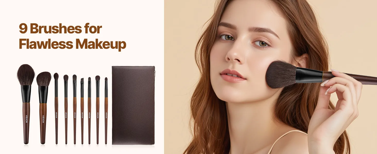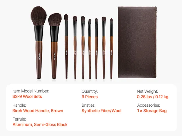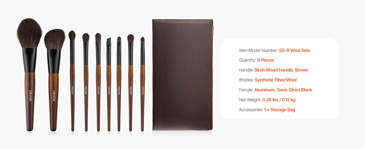 VEVOR Make-upkwastenset, 9-delige professionele make-upkwastenset voor foundation en oogschaduw, met synthetische haren, zachte natuurlijke wol, ergonomische houten handgreep, opbergtas voor op reis