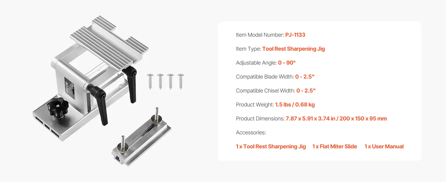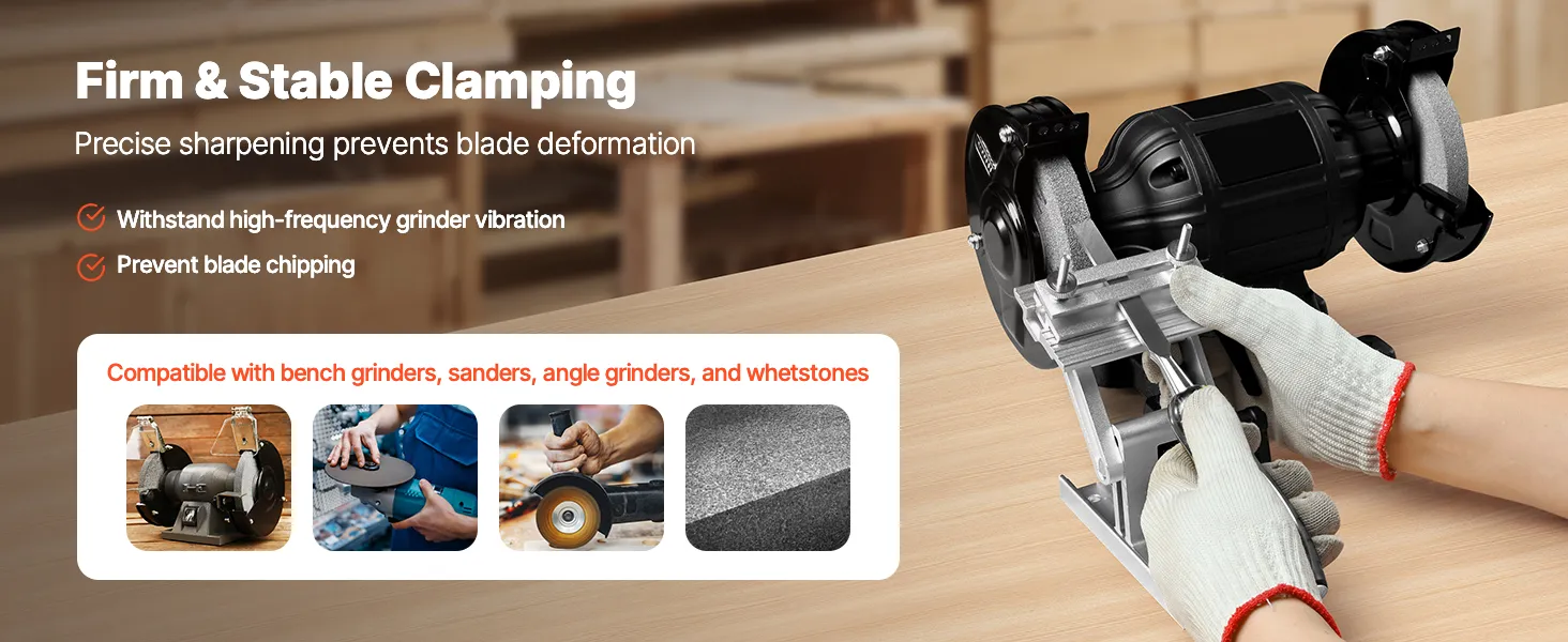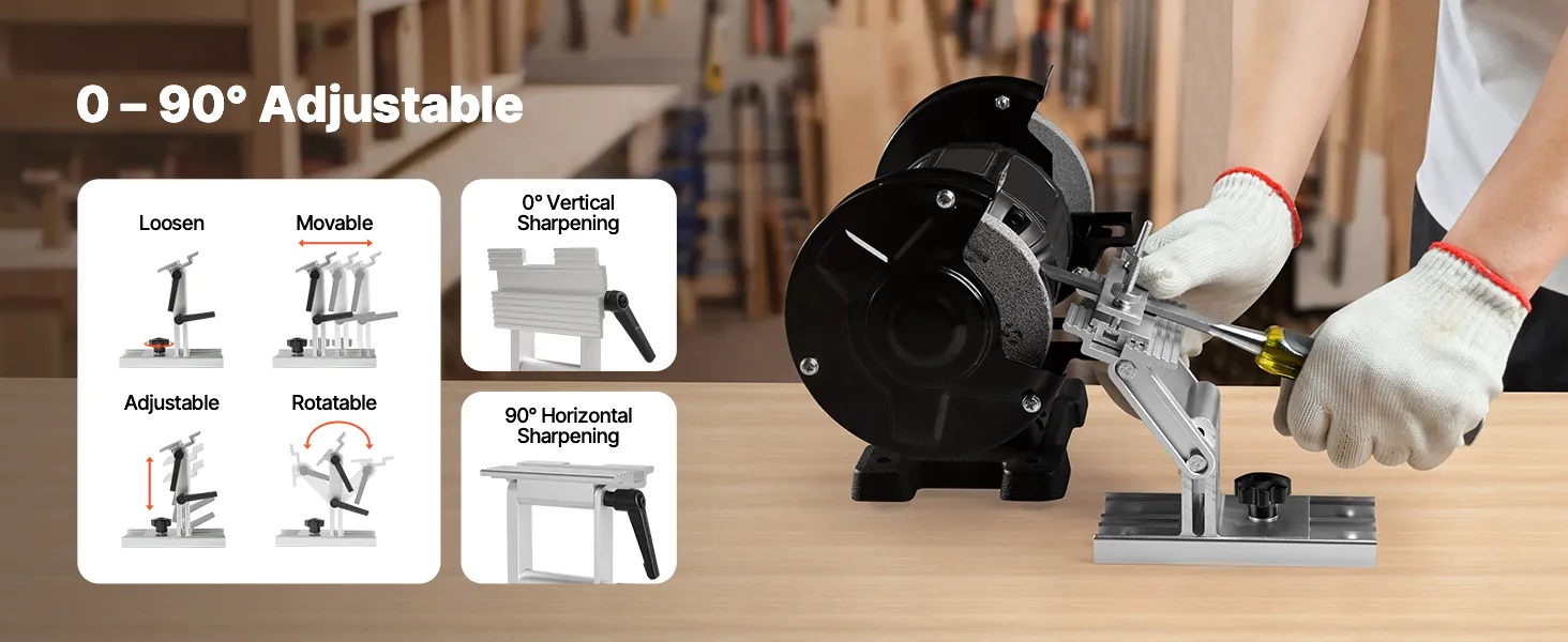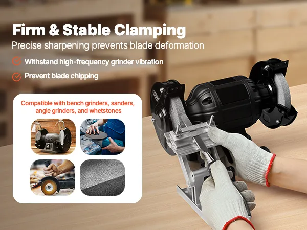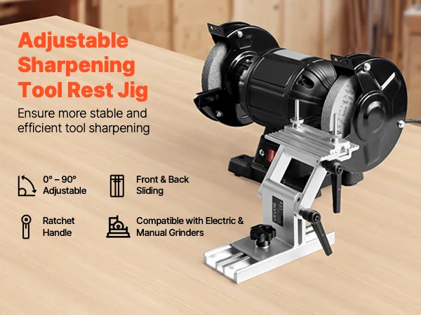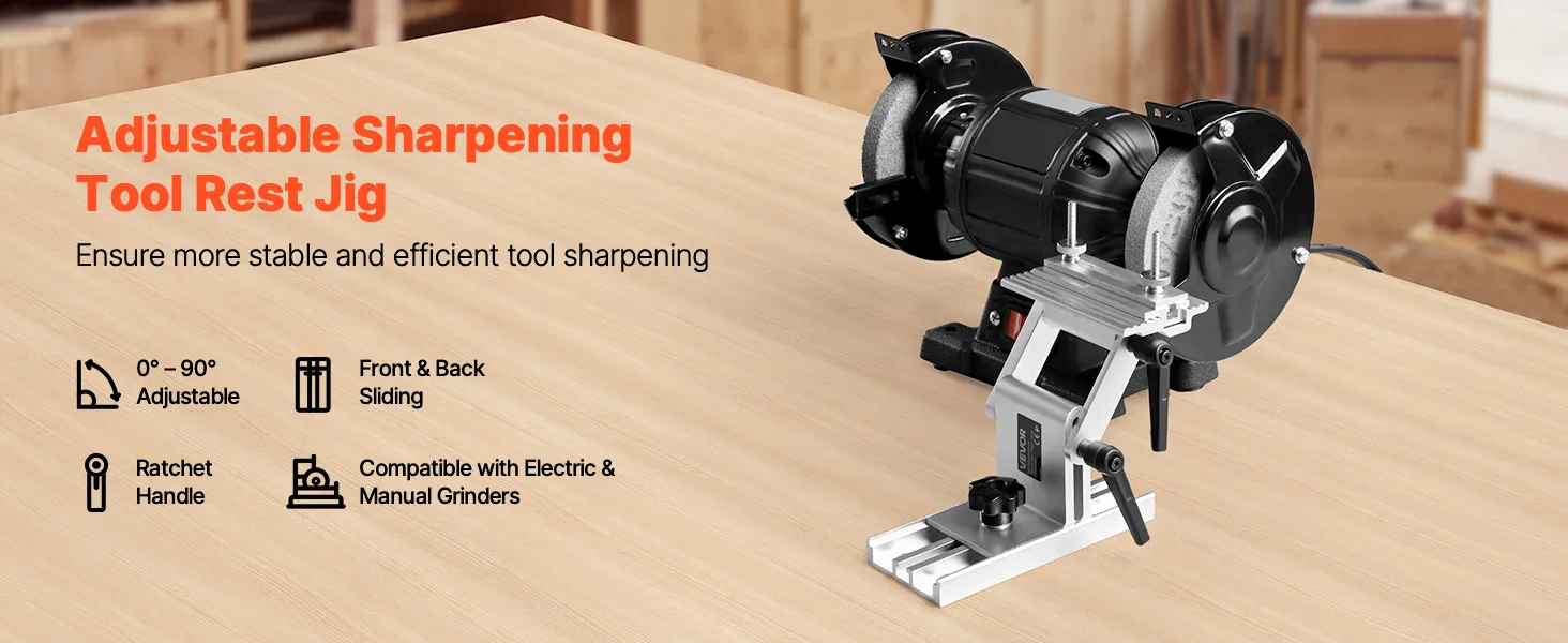 Brede compatibiliteit: De VEVOR slijpmal is compatibel met de meeste handmatige of elektrische bankslijpmachines (15 cm en 20 cm) en haakse slijpmachines. Hij is geschikt voor zaagbladen en beitels tot 6,35 cm breed. (Bankslijpmachine niet inbegrepen)