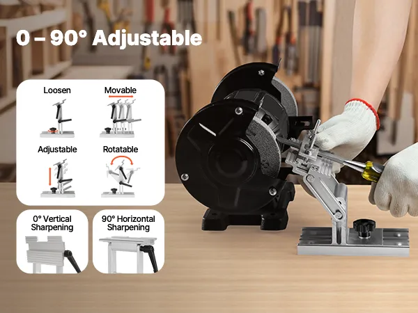 Het draaibare platform is verstelbaar van 0 tot 90 graden, waardoor je de slijphoek eenvoudig kunt finetunen voor optimale precisie. Zodra je de gewenste hoek hebt ingesteld, vergrendel je het eenvoudig met de handgreep.