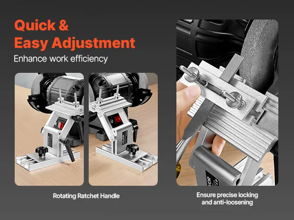 Flexibele aanpassing: Onze beitelslijper zorgt voor soepel voor- en achterwaarts glijden. Eenmaal gepositioneerd, zet u hem eenvoudig vast met de verstelknop. Hij is ook voorzien van twee ratelgrepen waarmee u de hoogte omhoog en omlaag kunt verstellen en het platform 0-90 graden kunt draaien.