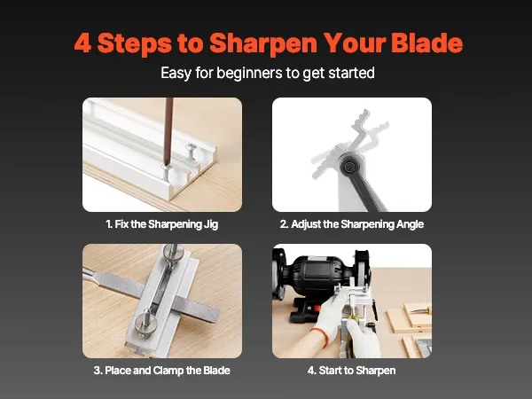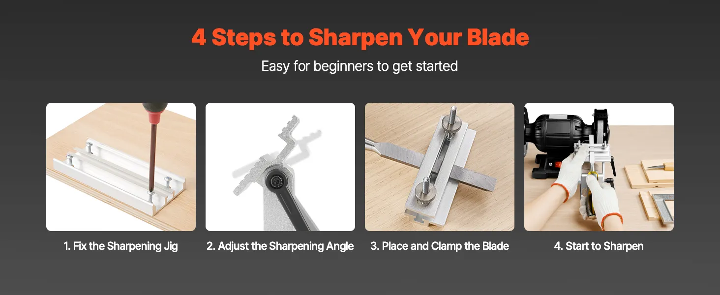 Gebruiksvriendelijk: Slijp het mes stabiel en efficiënt in slechts 4 eenvoudige stappen: 1. Bevestig de slijpmal stevig. 2. Stel de slijphoek in. 3. Bevestig het mes. 4. Begin met slijpen met uw bankslijpmachine.