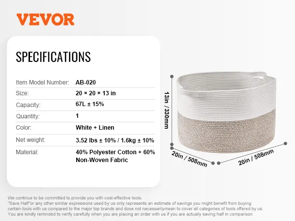 Grote capaciteit: deze cilindrische opbergmand heeft een afmeting van 508 x 508 x 330 mm en biedt diepe, ruime opbergruimte. Met een inhoud van 67 liter kun je in deze katoenen touwmand gemakkelijk huishoudelijke spullen opbergen, zodat je moeiteloos alles kunt ordenen en je ruimte optimaal kunt benutten.