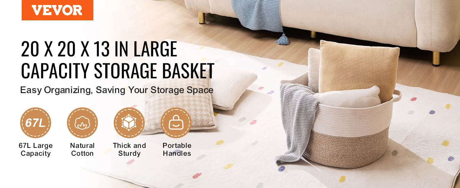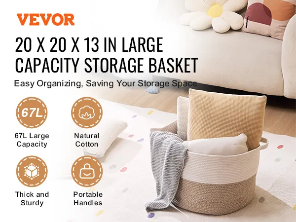 VEVOR Katoenen mand 508 x 508 x 330 mm, dekenmand, 67 L, mand van katoenen touw, geweven mand met handvatten, wasmand, opvouwbaar, opbergmand voor het organiseren van kleding, kinderspeelgoed en kussens