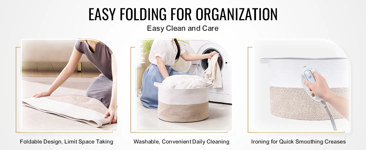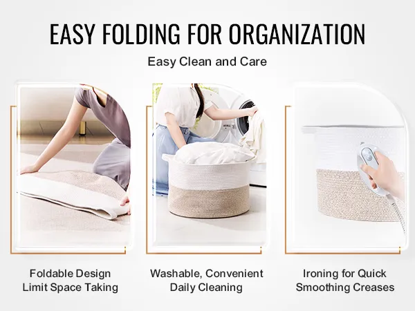Onze opbergmanden zijn gemaakt van hoogwaardig polyester-katoen en non-woven stof en kunnen gemakkelijk worden opgevouwen als ze niet worden gebruikt, waardoor je ruimte bespaart in je huis. Na het uitvouwen keren ze snel terug naar hun stabiele vorm en zijn ze klaar voor opslag.