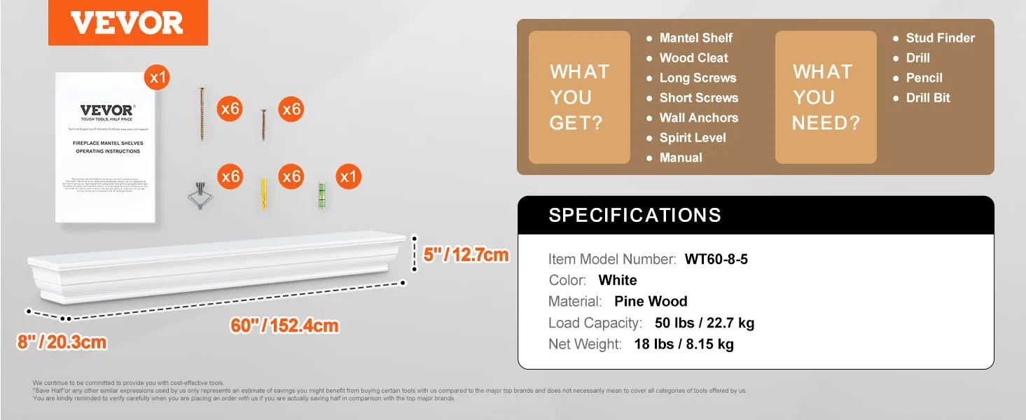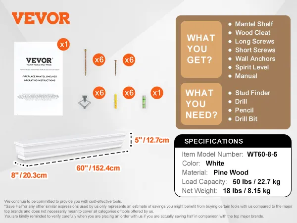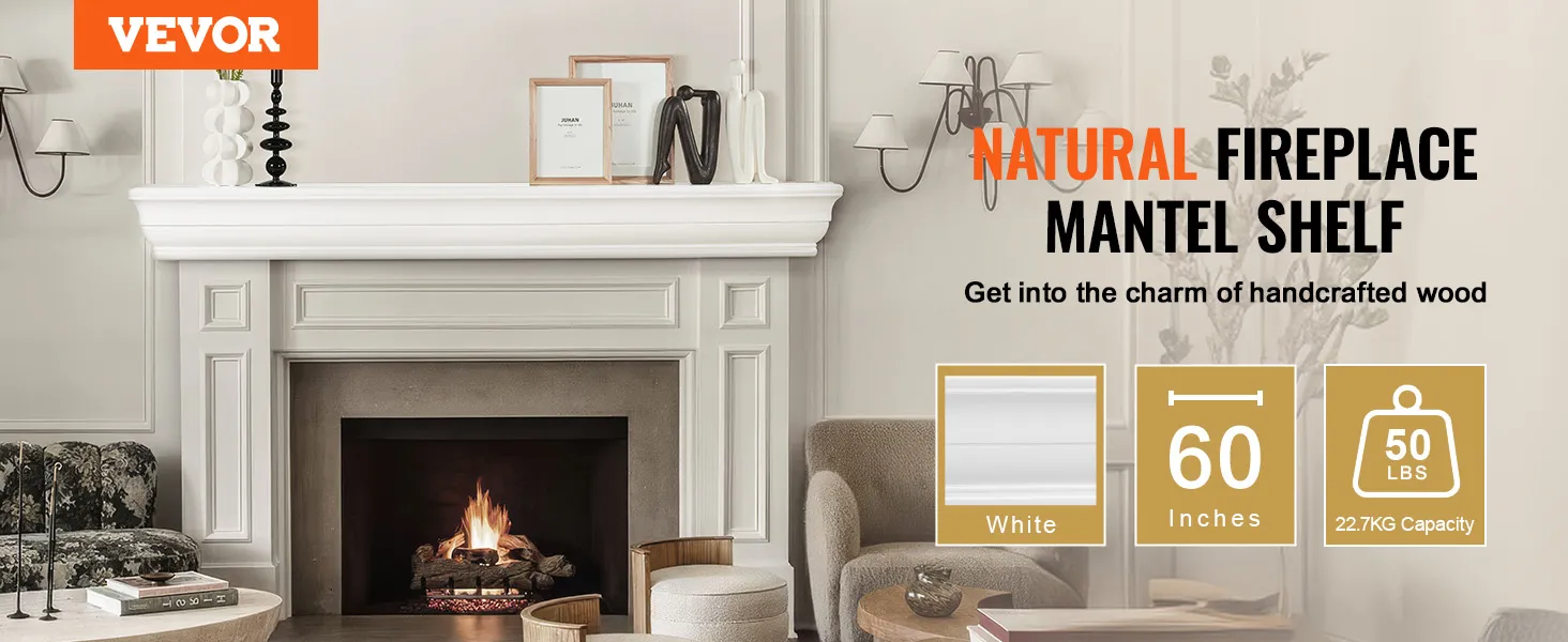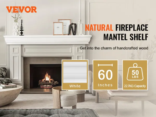 Know Your Mantel: This floating mantel shelf is available in a white color and measures 60 inches in length. With a weight capacity of 50 lbs, it's sturdy enough to display your favorite decor items, from family photos to cherished keepsakes.