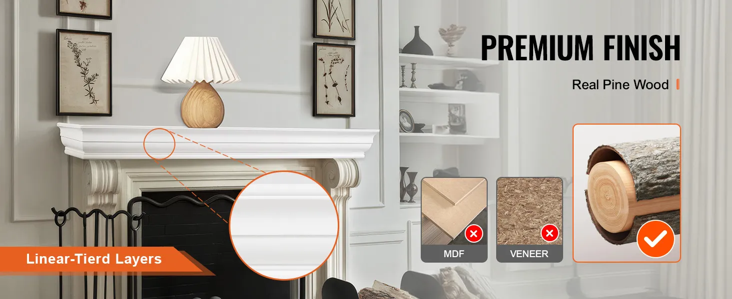 Solid Pine Wood: Crafted from real pine wood, our mantel shelf offers a perfect blend of beauty and durability. It features linear-tierd layers, providing elegant style with smoothened surface.