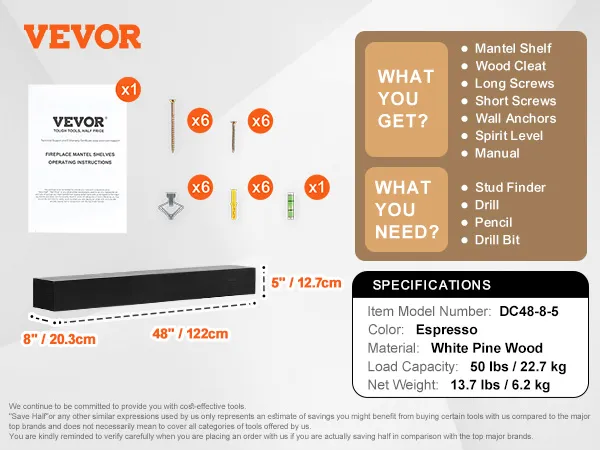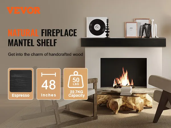 Know Your Mantel: This floating mantel shelf is available in an espresso color and measures 48 inches in length. With a weight capacity of 50 lbs, it's sturdy enough to display your favorite decor items, from family photos to cherished keepsakes.