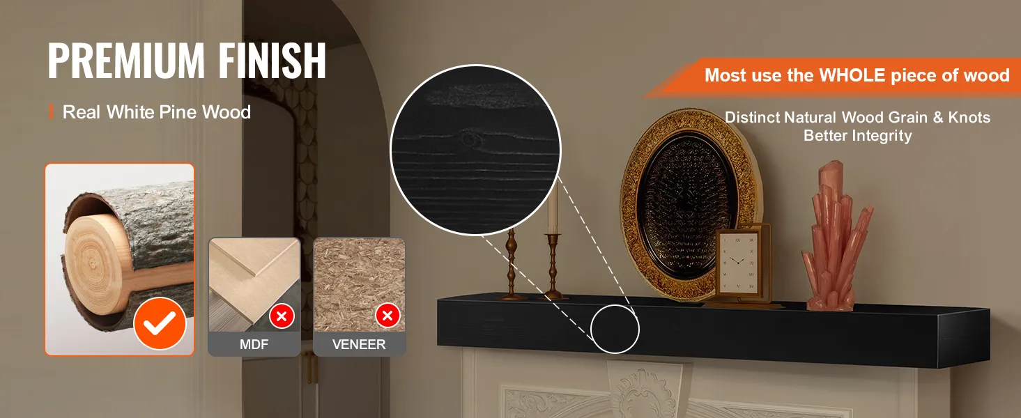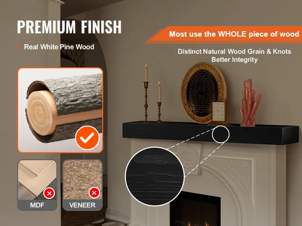 Solid Pine Wood: Crafted from real white pine wood, our mantel shelf offers a perfect blend of beauty and durability. Unlike MDF or veneer alternatives, it features distinct natural wood grain and knots, providing better integrity and a truly authentic look. Most use the whole piece of wood, ensuring a robust and durable structure.