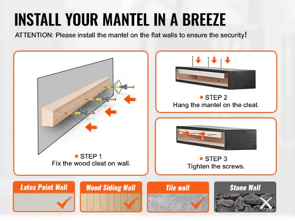 For secure and easy installation, make sure the wood mantel is affixed to flat walls. All necessary mounting hardware is included, simplifying the setup process and ensuring a firm installation.