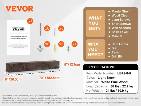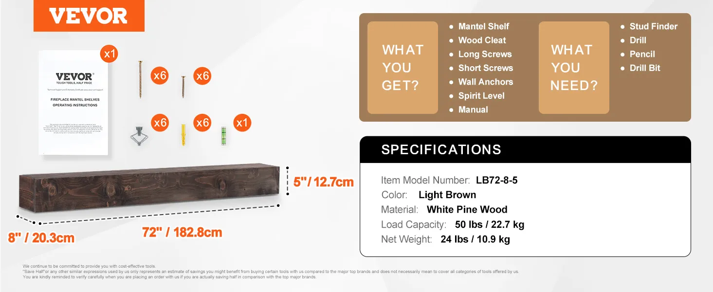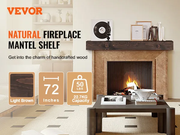 Know Your Mantel: This floating mantel shelf is available in a light brown color and measures 72 inches in length. With a weight capacity of 50 lbs, it's sturdy enough to display your favorite decor items, from family photos to cherished keepsakes.
