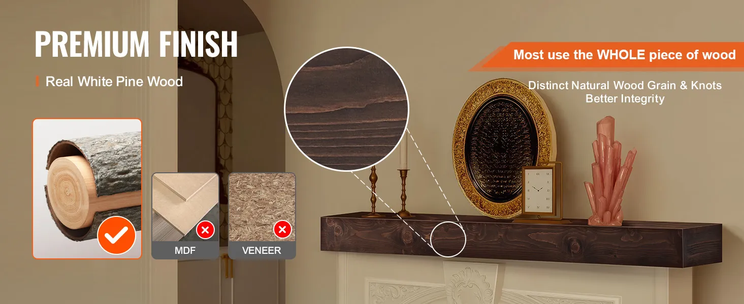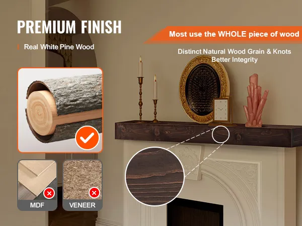 Solid Pine Wood: Crafted from real white pine wood, our mantel shelf offers a perfect blend of beauty and durability. Unlike MDF or veneer alternatives, it features distinct natural wood grain and knots, providing better integrity and a truly authentic look. Most use the whole piece of wood, ensuring a robust and durable structure.