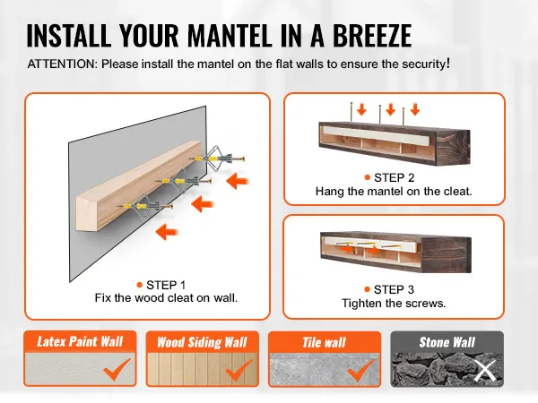 For secure and easy installation, make sure the wood mantel is affixed to flat walls. All necessary mounting hardware is included, simplifying the setup process and ensuring a firm installation.