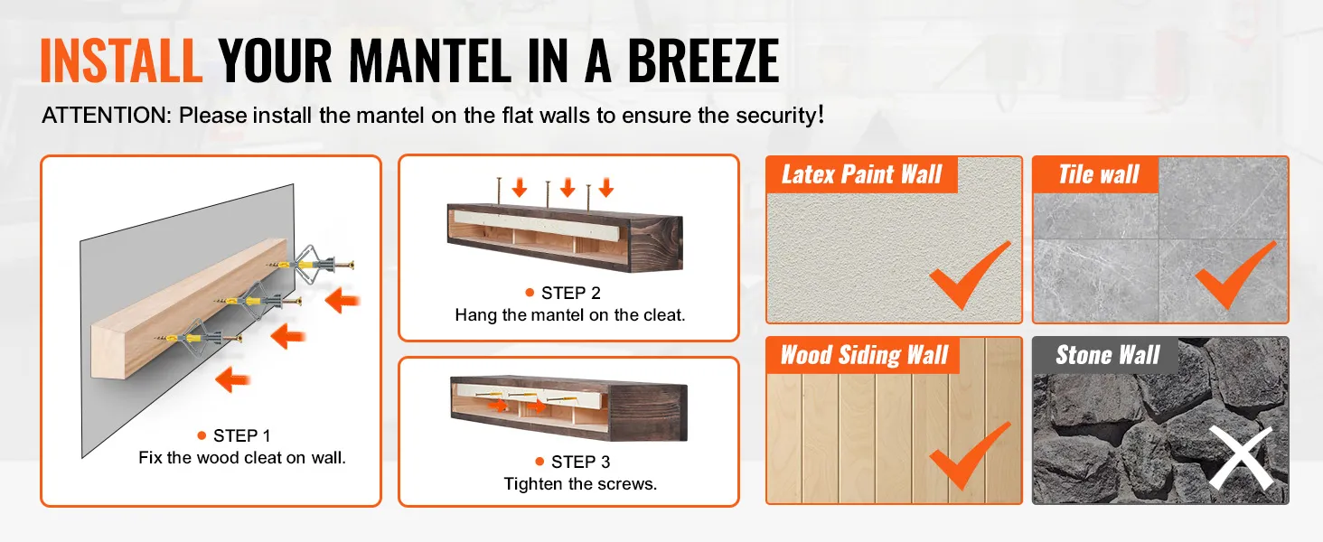 Easy to Install: For secure and straightforward installation, please ensure the wood mantel is mounted on flat walls. All necessary mounting hardware is included, making the assembly process quick and hassle-free.