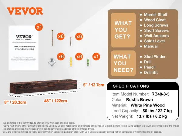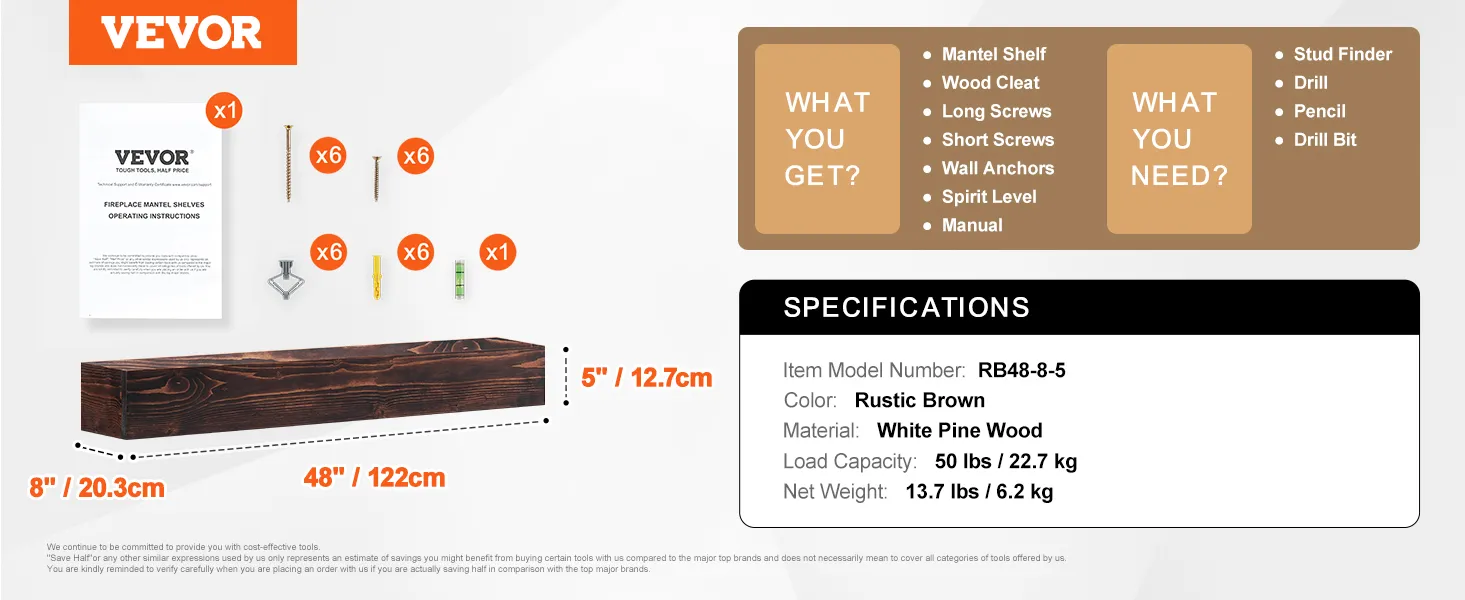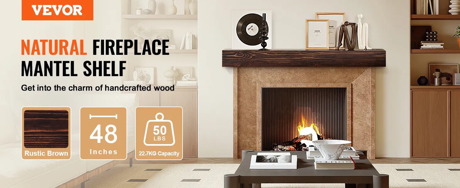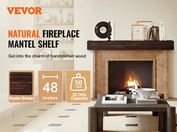 Know Your Mantel: This floating mantel shelf is available in a rustic brown color and measures 48 inches in length. With a weight capacity of 50 lbs, it's sturdy enough to display your favorite decor items, from family photos to cherished keepsakes.