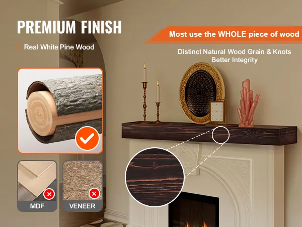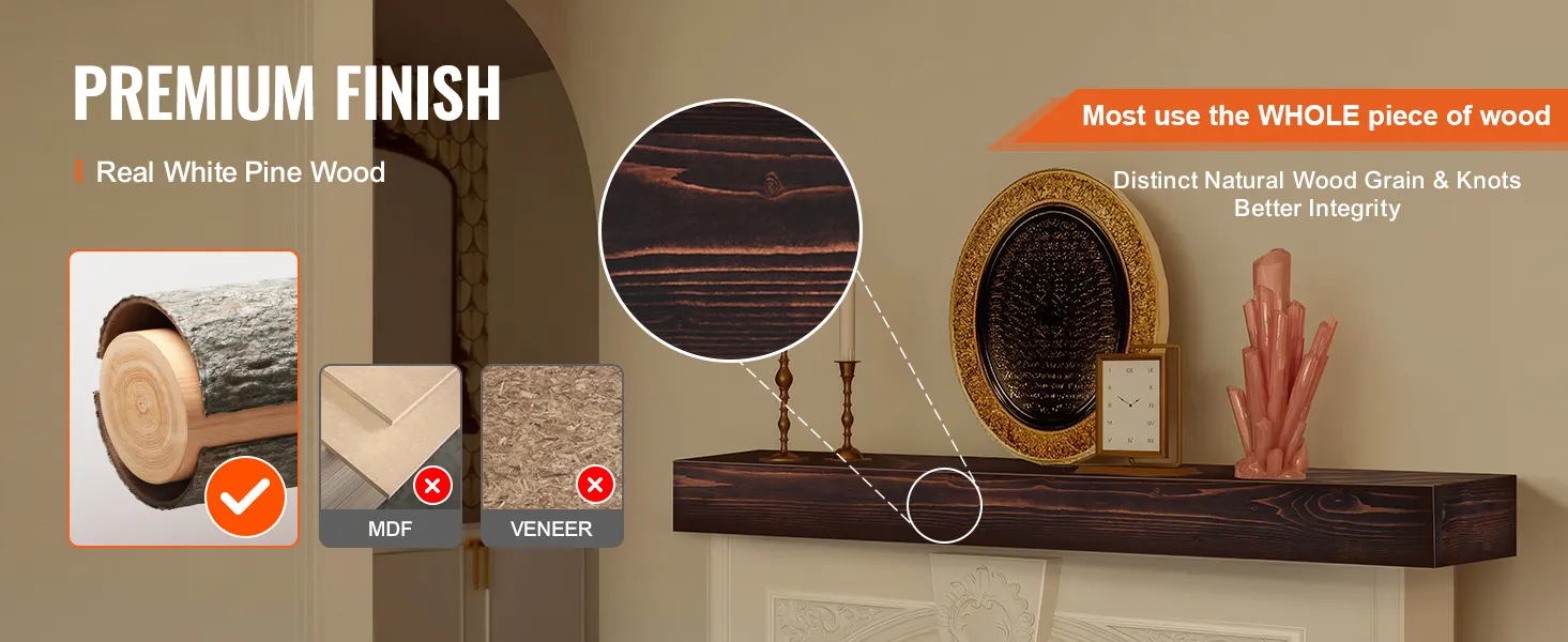 Solid Pine Wood: Crafted from real white pine wood, our mantel shelf offers a perfect blend of beauty and durability. Unlike MDF or veneer alternatives, it features distinct natural wood grain and knots, providing better integrity and a truly authentic look. Most use the whole piece of wood, ensuring a robust and durable structure.