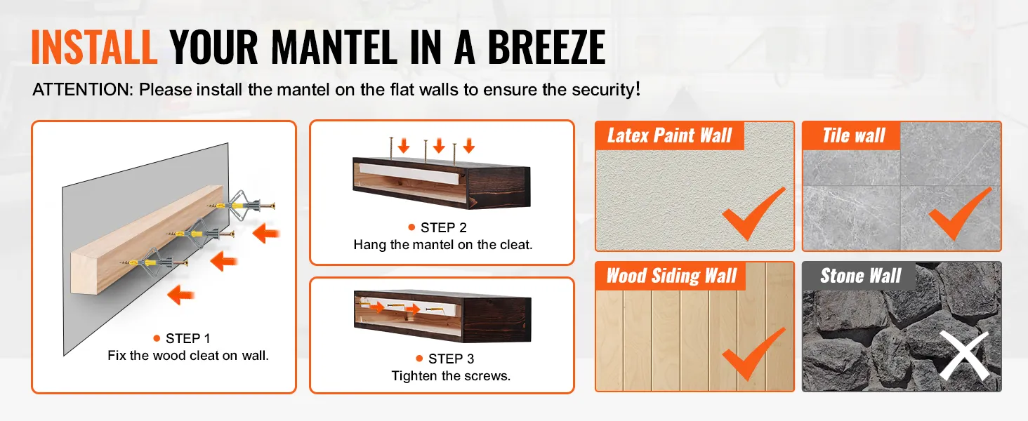 Easy to Install: For secure and straightforward installation, please ensure the wood mantel is mounted on flat walls. All necessary mounting hardware is included, making the assembly process quick and hassle-free.