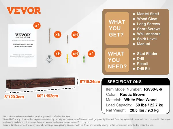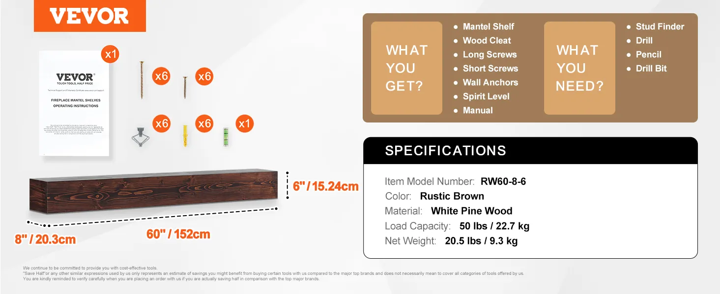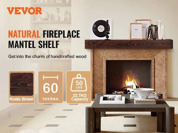 Know Your Mantel: This floating mantel shelf is available in a rustic brown color and measures 60 inches in length. With a weight capacity of 50 lbs, it's sturdy enough to display your favorite decor items, from family photos to cherished keepsakes.