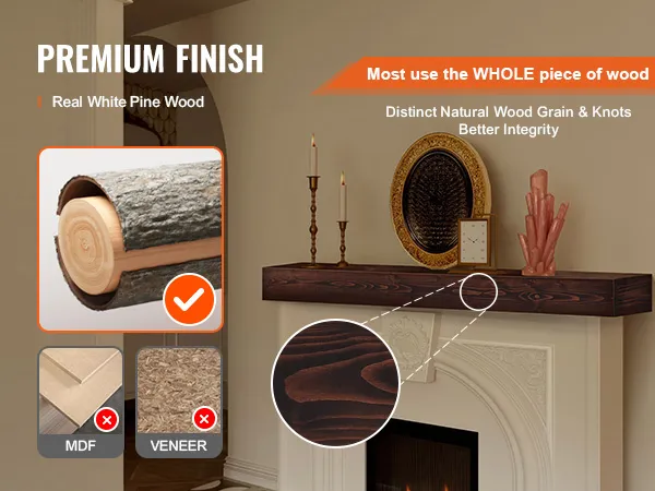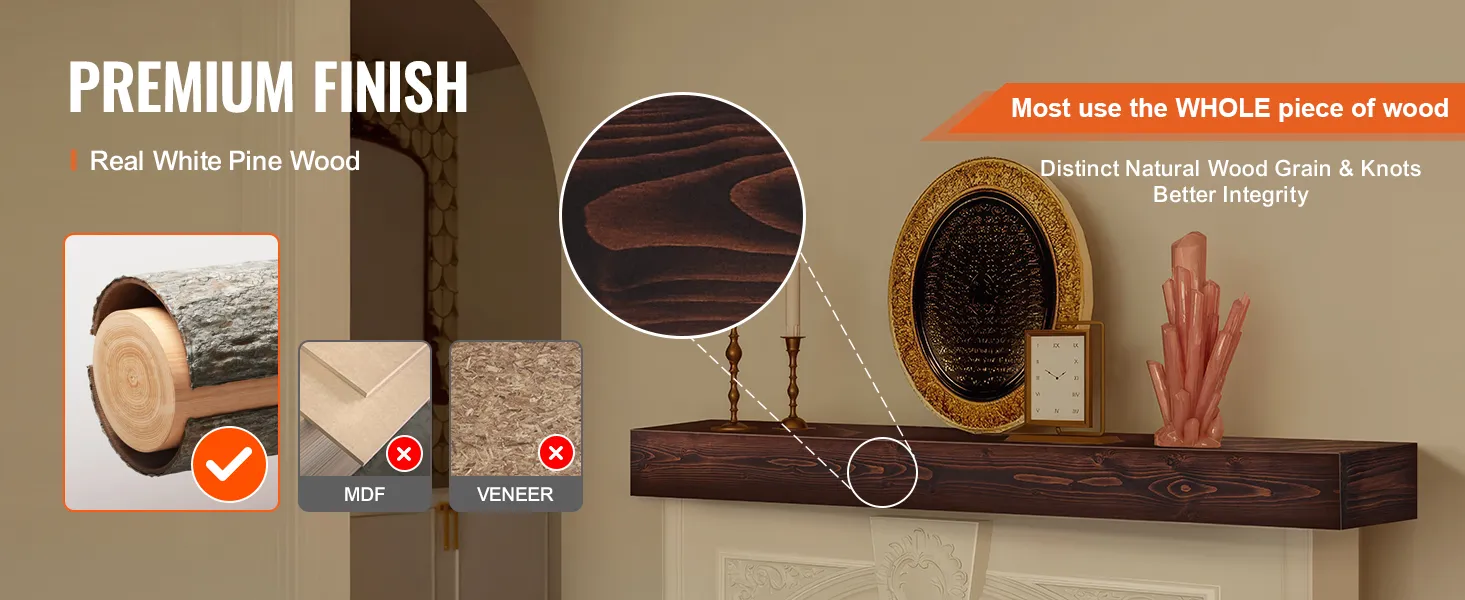 Solid Pine Wood: Crafted from real white pine wood, our mantel shelf offers a perfect blend of beauty and durability. Unlike MDF or veneer alternatives, it features distinct natural wood grain and knots, providing better integrity and a truly authentic look. Most use the whole piece of wood, ensuring a robust and durable structure.