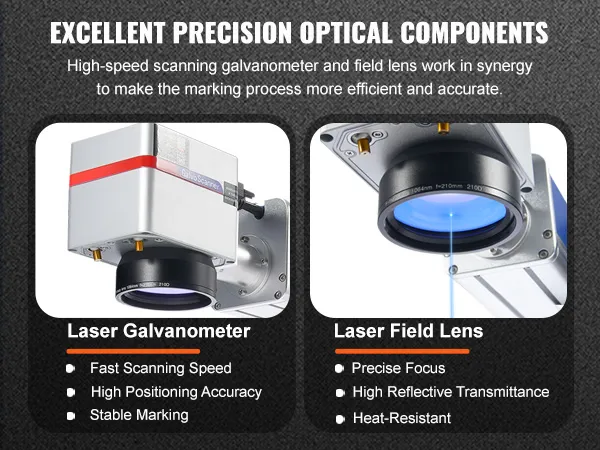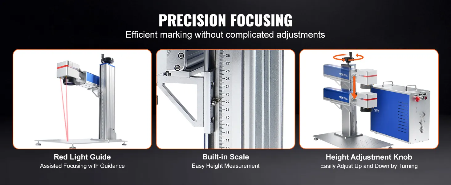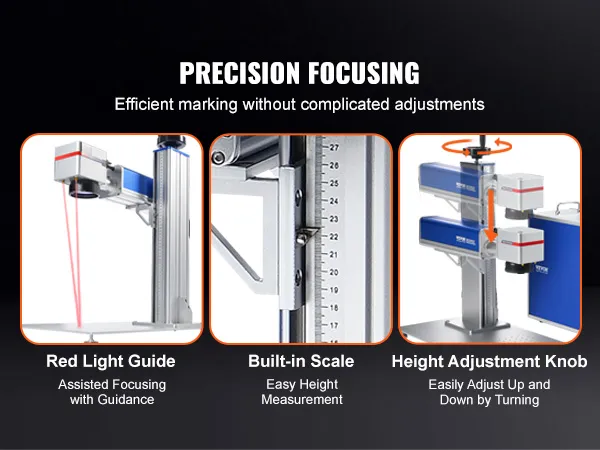 Nauwkeurige focus: onze lasermarkeermachine is uitgerust met een hulpfocussysteem met rood licht en een in hoogte verstelbare galvanometer. Deze configuratie maakt snelle focusaanpassingen mogelijk voor efficiënt en nauwkeurig graveren.