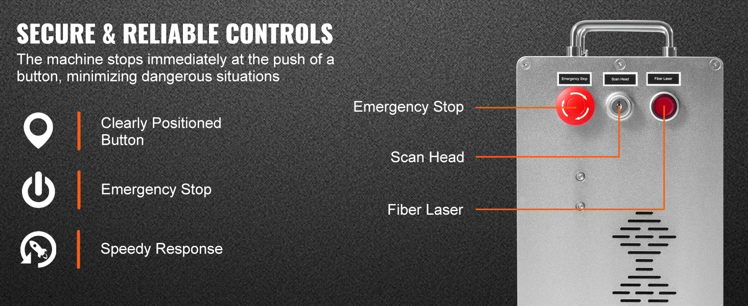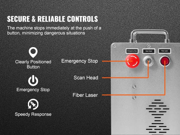 Deze fiberlasermachine is voorzien van een duidelijk zichtbare en eenvoudig te bedienen noodstopschakelaar. In geval van brand of een ander noodgeval tijdens het markeren, zal het indrukken van deze schakelaar de machine onmiddellijk stoppen, wat de veiligheid vergroot.