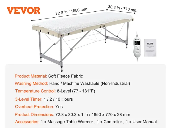 Let VEVOR massage table warmer enhances your massage experience with 1-inch thickened plush fabric that delivers warmth and comfort. With 77-131°F temperature range, 8 heat settings, 3-level timer and overheating protection, it ensures safety and convenience for a warm and cozy experience.