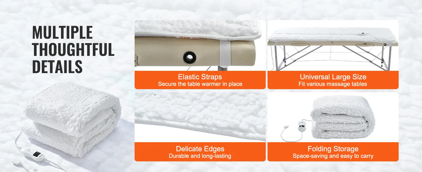 • Crafted for Convenience: Our heated spa table pad has various thoughtful design: elastic straps keep it securely in place during use, and its large size fits different massage tables. The strong edge stitching makes it more durable and stylish, while the foldable design allows for easy storage without taking up much space.