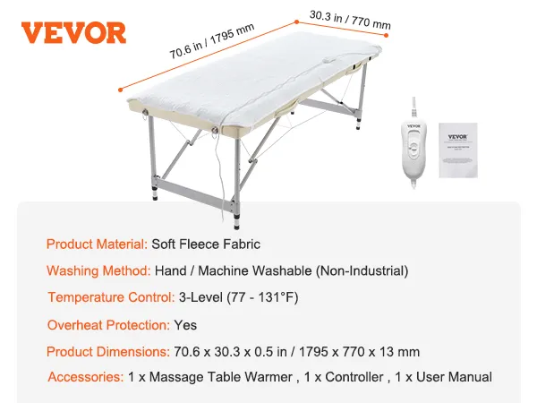 • High Quality Material: VEVOR 71" x 30" massage table warmer is made from 0.5-inch thick, soft fleece fabric, providing a gentle and comfortable touch against your skin. It effectively retains heat, ensuring a stable temperature during prolonged use, keeping your full body warm and delivering a more relaxing massage.