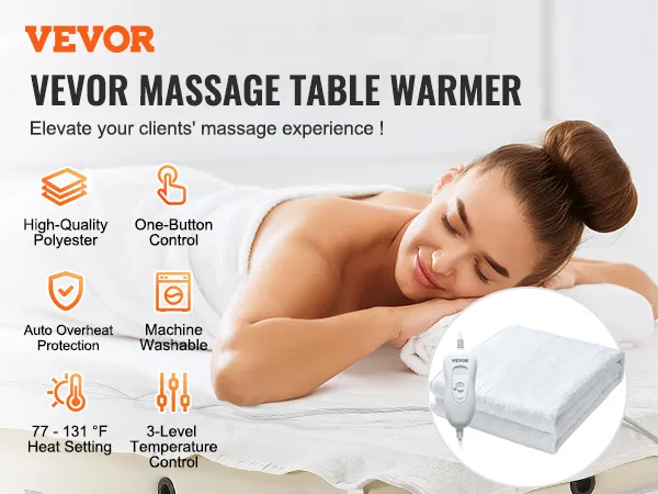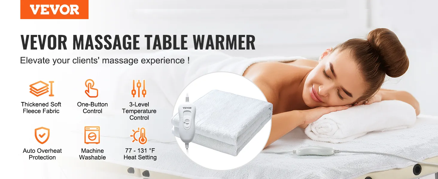 Let VEVOR massage table warmer enhances your massage experience with 0.5-inch thick fleece fabric that delivers exceptional warmth and comfort. With a temperature range of 77-131°F, 3 heat settings and overheating protection, it ensures both safety and convenience for a warm and cozy experience.
