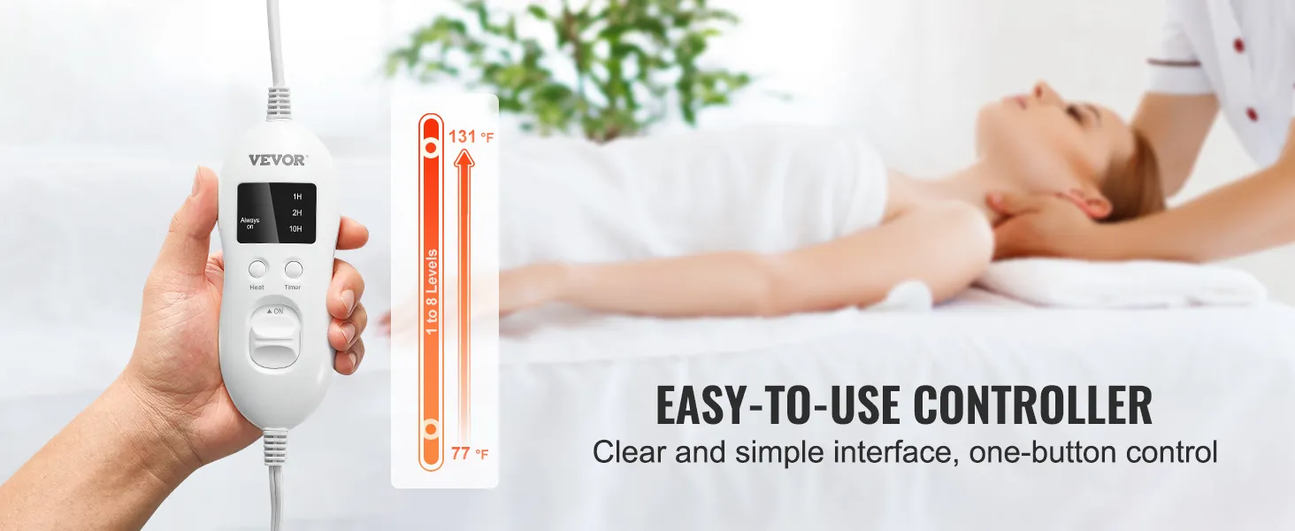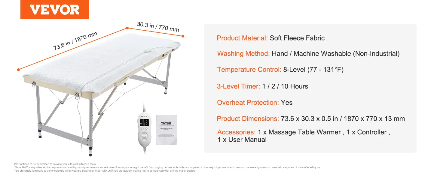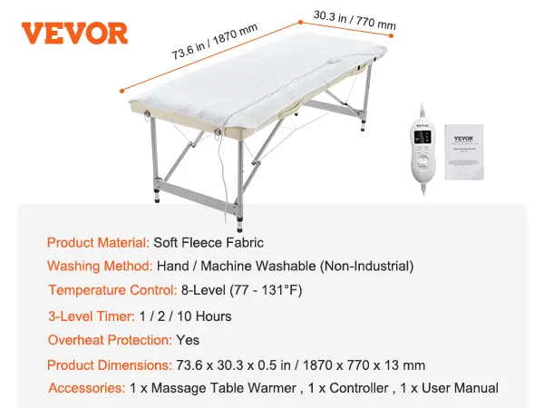 Let VEVOR massage table warmer enhances your massage experience with 0.5-inch thick plush fabric that delivers warmth and comfort. With 77-131°F temperature range, 8 heat settings, 3-level timer and overheating protection, it ensures safety and convenience for a warm and cozy experience.