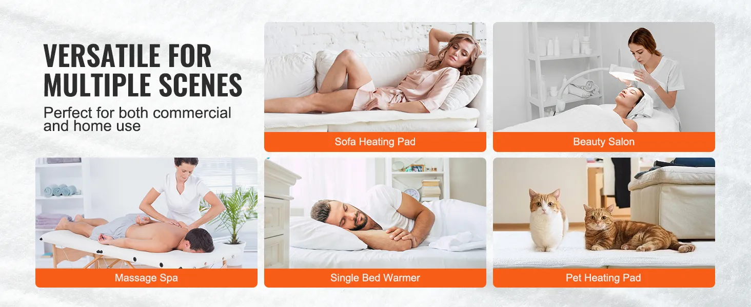 The VEVOR massage heating pad is not limited to massage studios; it's also perfect for beauty salons, home use, and can even serve as a heating pad for sofas, pets, or single beds. Enjoy long-lasting warmth and comfort, elevate clients' massage experience!