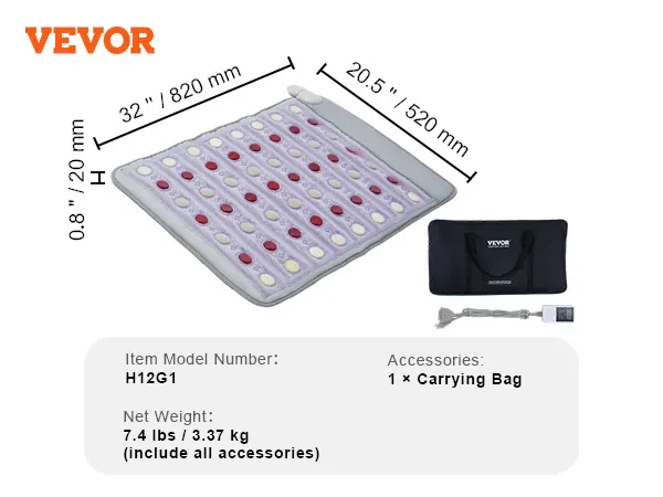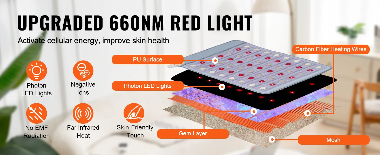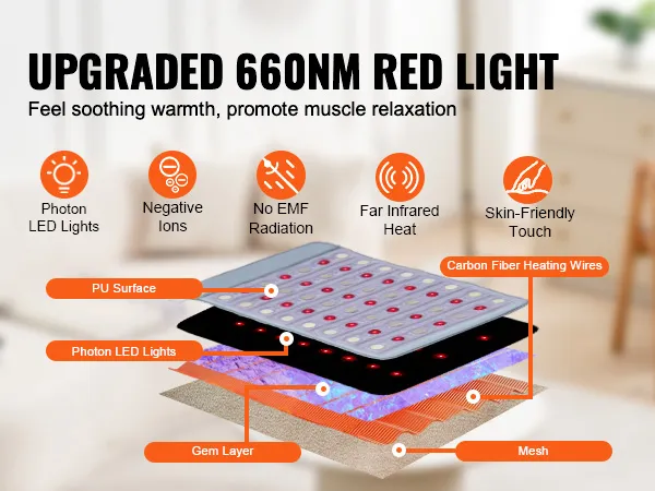 Met behulp van 660 nm fotonrood licht en ver-infraroodstralen dringt deze verwarmde mat met natuurlijke edelstenen diep door in de spierlagen om pijn en vermoeidheid te verlichten.