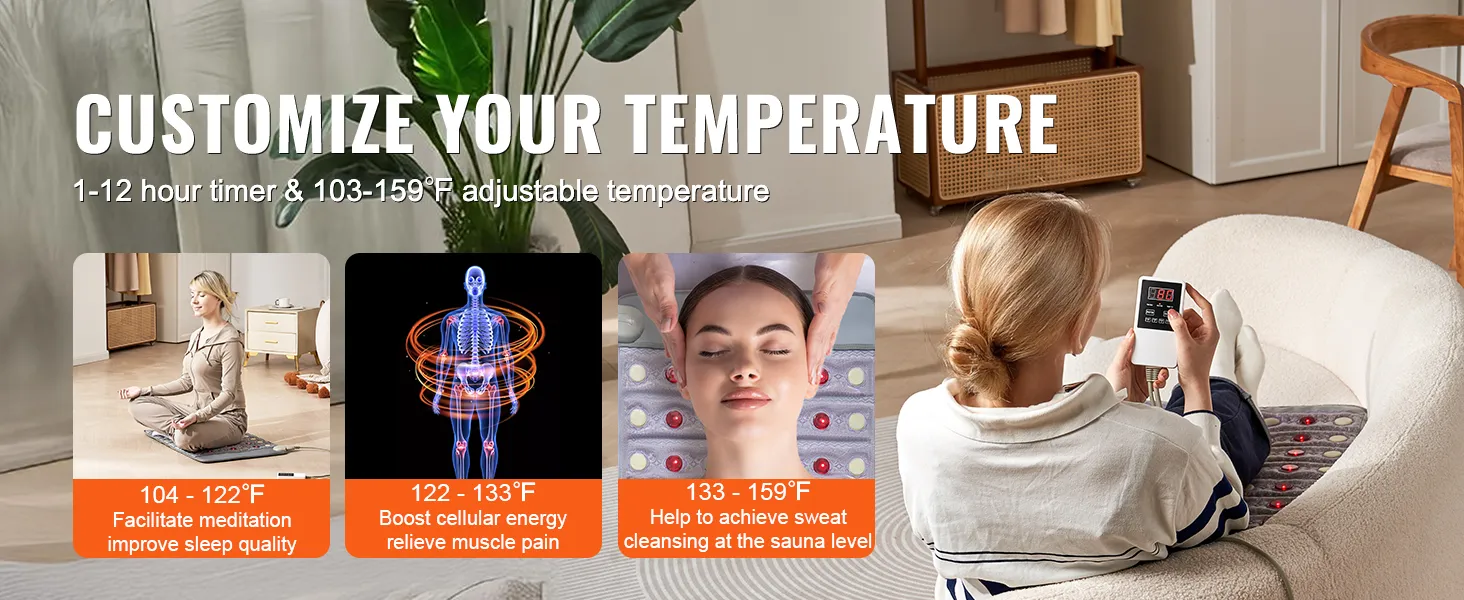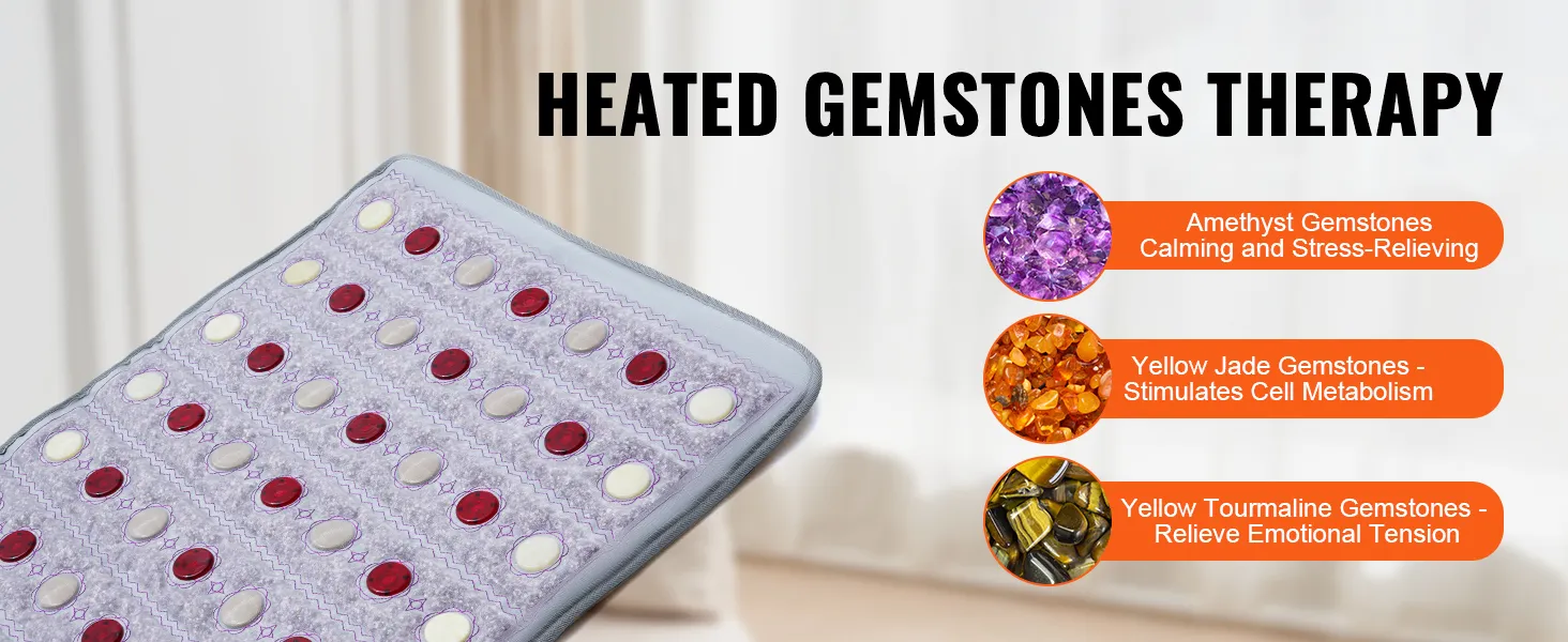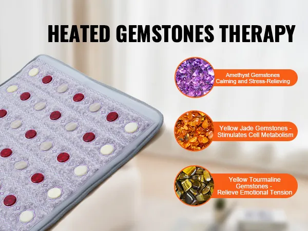 Verbeterde veiligheid: deze verwarmde edelsteentherapiemat is uitgerust met een verwarmingsdraad van koolstofvezel en zendt gelijkmatig verre infraroodstralen uit die diep in de spierlagen doordringen en vermoeidheid verlichten. Omdat het vrij is van schadelijke EMF-straling, zorgt het voor gemoedsrust en veilig gebruik, waardoor een gezonder en meer ontspannend therapeutisch effect wordt bevorderd.
