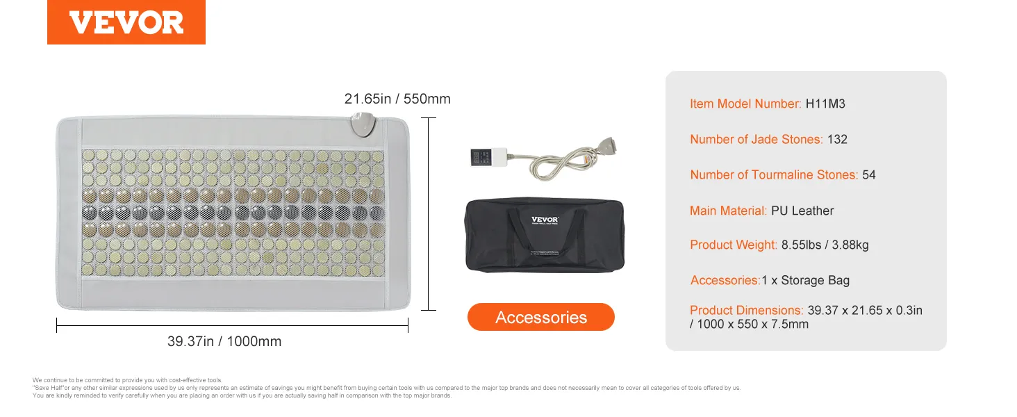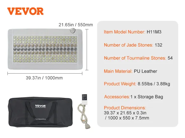 3-in-1 Health Therapy: VEVOR 39.4" x 21.7" far infrared heating pad combines professional far-infrared technology, 132 natural jade stones and 54 tourmaline stones to deeply penetrate and relieve body muscle, promote blood circulation, improve sleep quality and restore body vitality, perfect for daily relaxation and stress relief.