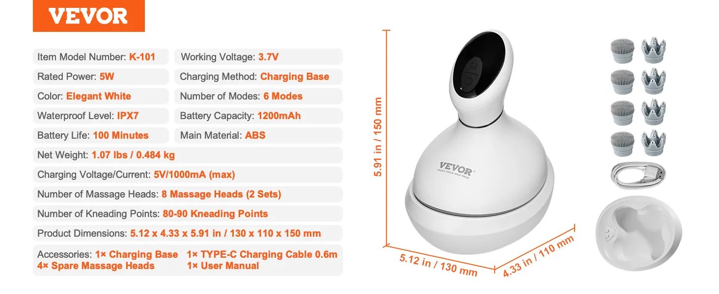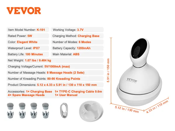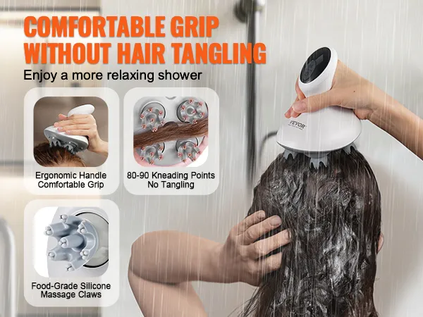 Waterdicht en huidvriendelijk: VEVOR elektrische hoofdhuidmassageapparaat is gemaakt van IPX7 waterdicht materiaal en is geschikt voor nat en droog gebruik, zodat u zelfs onder de douche van hoofdhuidmassages kunt genieten. De zachte siliconenkoppen met 80-90 massageknopen voorkomen dat het haar in de war raakt en zorgen voor een zachte massage-ervaring. Afneembare massagekoppen maken het schoonmaken eenvoudig en handig.