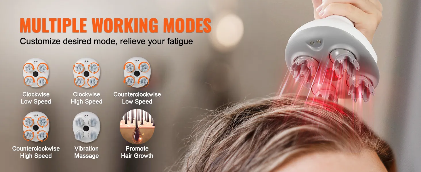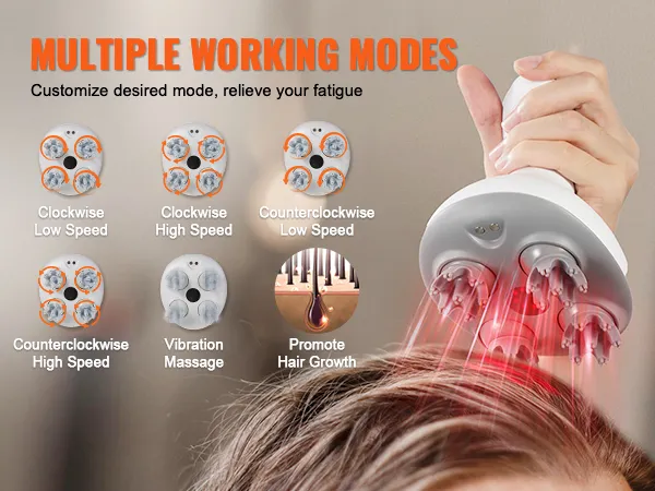 Gepersonaliseerd comfort: deze hoofdhuidstimulator voor haargroei heeft 6 modusinstellingen voor opties: lage snelheid met de klok mee, hoge snelheid met de klok mee, lage snelheid tegen de klok in, hoge snelheid tegen de klok in, vibratiemassage en bevordering van de haargroei. Kies uit meerdere instellingen voor een massage-ervaring op maat.