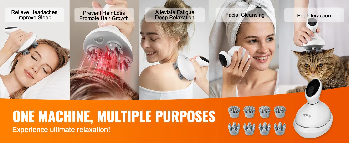 Onze draagbare, oplaadbare hoofdmassager is ontworpen voor ultieme ontspanning. Het verlicht hoofdpijn, verbetert de slaap, voorkomt haaruitval, bevordert de haargroei, ontspant diep, reinigt de gezichtshuid en maakt zelfs interactie met huisdieren mogelijk.