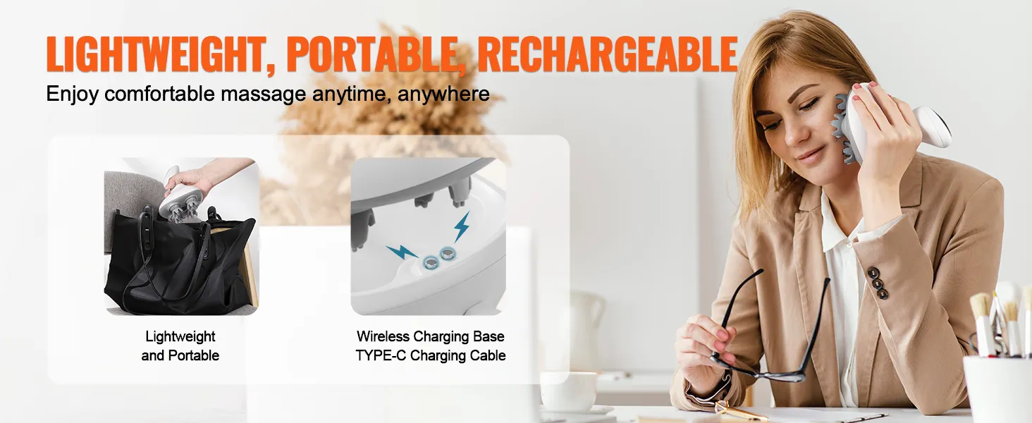 Oplaadbaar en draagbaar: onze draagbare kneedhoofdmassager wordt aangedreven door een oplaadbare lithium-ionbatterij, zodat u hem kunt gebruiken zonder hem aan te sluiten. Het bevat een oplaadstation en een USB-oplaadkabel en zorgt voor urenlang gebruik als het volledig is opgeladen. Compact en draadloos, zodat u altijd en overal kunt genieten van rustgevende massages, thuis of onderweg.