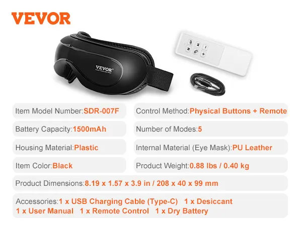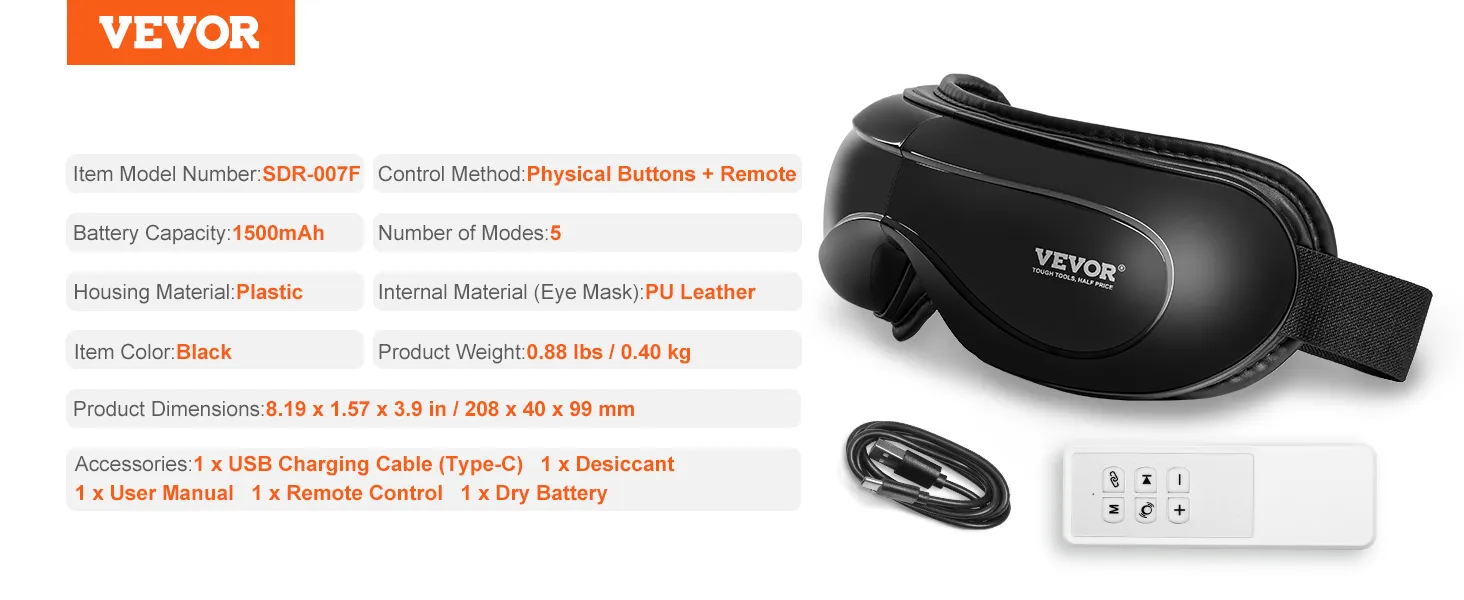Heated Eye Massage: Enjoy soothing relief with VEVOR eye massager's built-in heating pad, delivering comfortable heating therapy at 104℉-107℉. Effectively alleviates eye fatigue, puffiness, and dryness, and helps reduce dark circles, promoting refreshed eyes. (Not recommended for individuals with recent eye surgery, retinal disorders, cataracts, or glaucoma.)