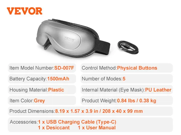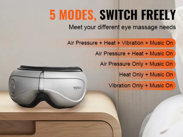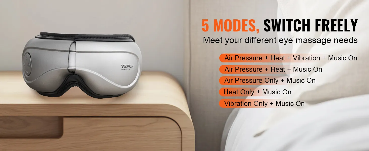 Experience personalized and soothing eye care with VEVOR eye massager. Enjoy 104°-107℉ heating therapy to alleviate fatigue, plus 5 massage modes for tailored comfort. Bluetooth connectivity and built-in white noise offer an immersive music experience. Eyes revived, stress relieved.