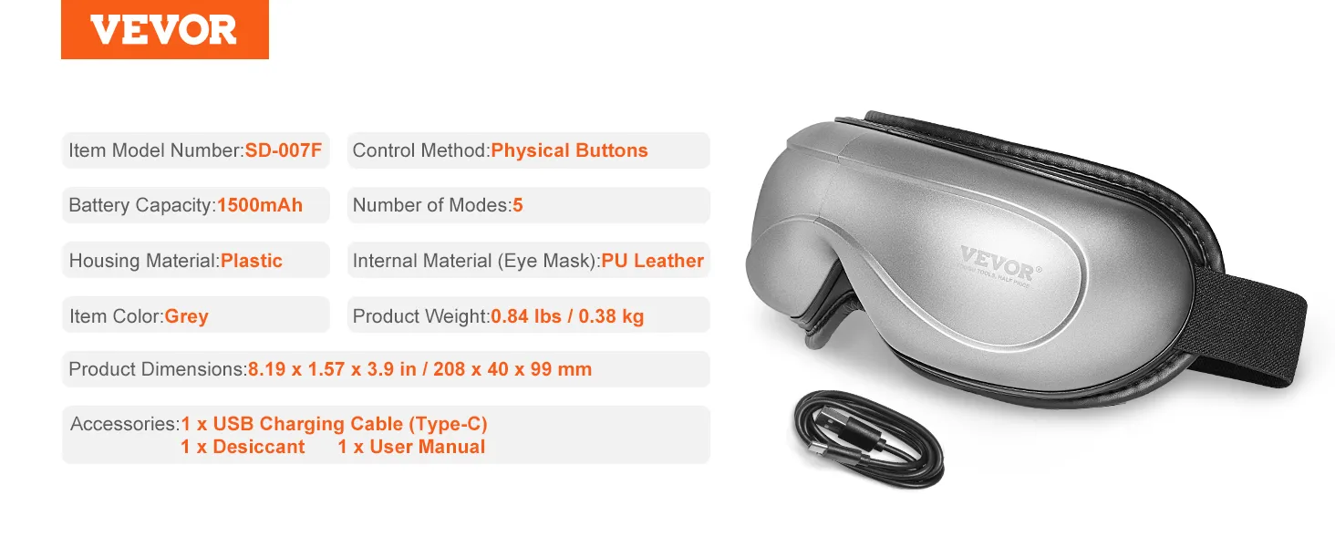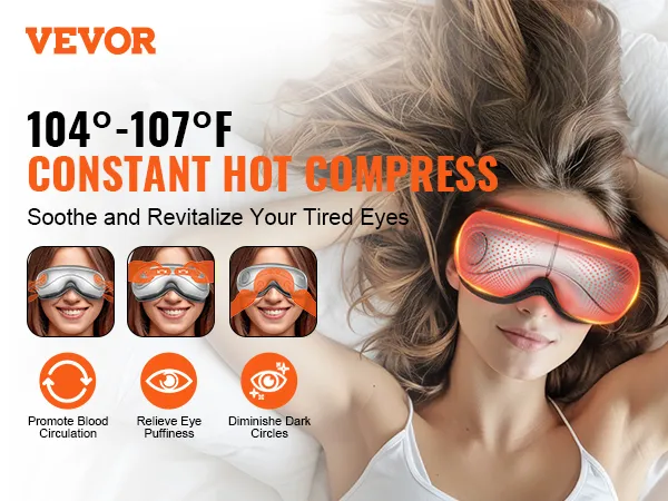 Heated Eye Massage: Enjoy soothing relief with VEVOR eye massager's built-in heating pad, delivering comfortable heating therapy at 104℉-107℉. Effectively alleviates eye fatigue, puffiness, and dryness, and helps reduce dark circles, promoting refreshed eyes. (Not recommended for individuals with recent eye surgery, retinal disorders, cataracts, or glaucoma.)